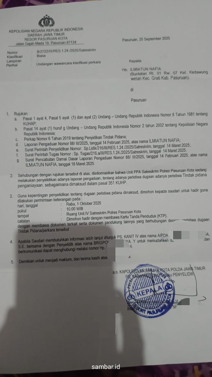Publik kini menanti langkah tegas dari Polda Jawa Timur, Propam Polri, dan Seksi Propam Polres Pasuruan Kota untuk memastikan kasus ini ditangani profesional, transparan, dan berpihak pada keadilan.