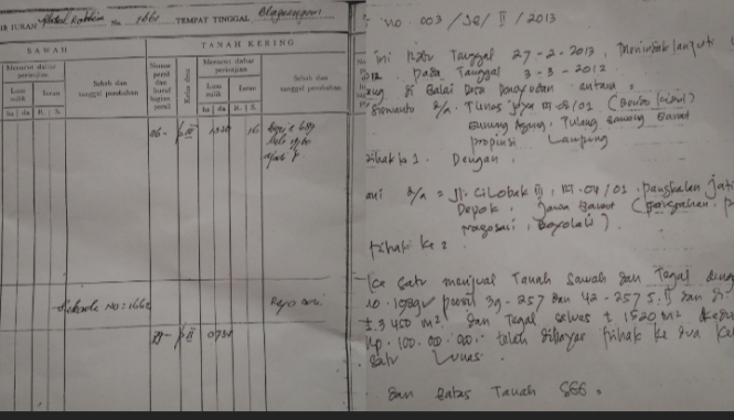 Pihak pertama, Samidin atau Siswanto, beralamat di Tunas Jaya, Lampung, menjual tanah sawah dan tegal dengan bukti C Desa No. 1989 kepada Sri Mulyani, warga Depok, Jawa Barat.